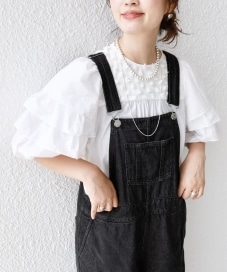 カジュアルなオーバーオールに甘さをプラスしたコーディネートにしました。スラックス等との甘辛コーデも楽しめそうです!