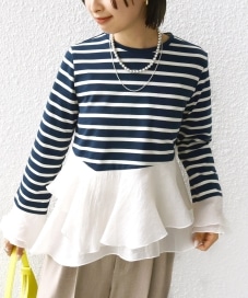 着心地:カジュアルになりがちなボーダーアイテムですが、フリルティアードで女性らしい印象に仕上がります♪