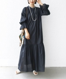 着心地:ティアードシルエットが女性らしいワンピース。袖口はゴムの仕様なので、たくし上げたスタイルもきれいにきまります。