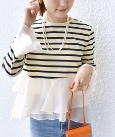 カットソー素材のボーダーとの組み合わせでフリルデザインでも甘くなりすぎない1枚◎