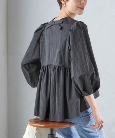 【素材感・着心地】程よくハリのある素材。首元は大きく開かないので安心感がある。後ろのリボンがアクセント。中にタートルを重ねても◎