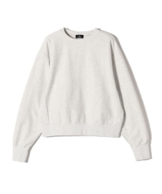 【素材感・着心地】コットンの柔らかい素材。スウェットとしては比較的薄手です。身幅、袖幅はゆったりとしていますが、着丈は少し短めなのでシャツなどをインナーにしたレイヤードスタイルもオススメです