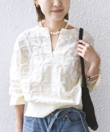着心地:軽い着心地。編み地に程良く透け感があるので通気性が良く、端境期に重宝します。ハーフジップデザインなので、開けて着ると抜け感がでます♪