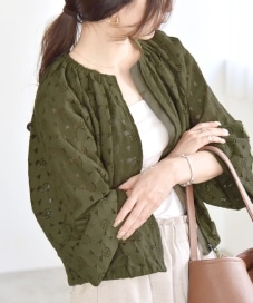 【素材感・着心地】一見繊細な花柄のレース素材ですがジップアップとタックでカジュアルに仕上がっているため着やすい一着です。