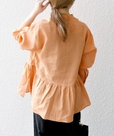 リネン混で涼しげな素材感になっており真夏でも着用して頂けます。見頃ゆったりめでサイドのリボンがアクセントになっており上品なデザインになっています。前開きで羽織りとしての使い方もおすすめです。