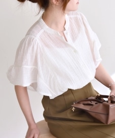 着用アイテム:スタンドカラー シアー フリル ハーフスリーブ ブラウス