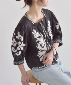 刺繍ブラウスにデニムを合わせて大人カジュアルなスタイリングに。