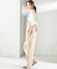 着心地:スッキリ見えするサイズ感であまりゆったりしてませんが、麻入りの柔らかい生地で着心地は良いです。黄色味が強すぎない大人っぽいベージュで、ベーシックカラー、カラーもの幅広く合わせられます。写真2枚目はベルトでウエスト固定してます。