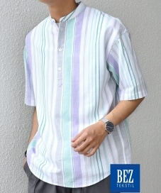 ◆ 商品 BEZ TEXTILE マルチカラー ストライプソリッド バンドカラープルオーバー シャツ