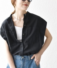 〔ONE SIZE〕SHIPS any:〈洗濯機可能〉リネン コットン バンドカラー フレンチスリーブ ポケット シャツ