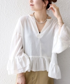 着用アイテム:SHIPS any:〈洗濯機可能〉コットン モス ラッフル フリル キーネック ブラウス