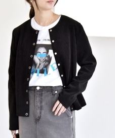 着用アイテム:ポリエステル ベロア リブ クルーネック コンパクト スナップ カーディガン