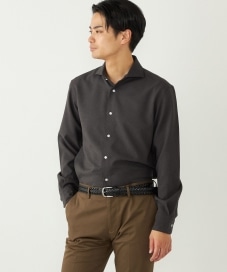 ノーアイロンのシャツ。ワイドカラー。やや光沢感がある素材感。