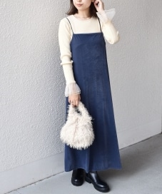 【素材感・着心地】ポリエステルベロア素材のワンピースになります。裏地が付いてるので透ける心配もなく、体のラインも拾いすぎません♪厚すぎない生地感なので、今の時期はTシャツやキャミソールなどを合わせていただき、寒い時期はタートルネックやジャケットとなどと合わせることで長い季節ご着用いただけます◎
