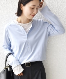 素材感:ヘンリーネック部分は薄すぎず厚すぎず、一枚でもインナーとしても着回ししやすいカットソー素材。内側のテレコは柔らかい肌触りです。