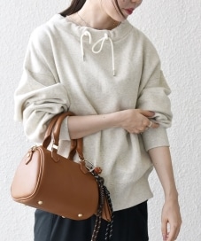 トップスとボトムはベーシックなカラーに、小物は差し色のブラウンで統一しました。ややゆったりめシルエットなので、Iラインなどすっきり見えするボトムスとも好相性です。