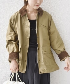 着用感 : メンズライクな雰囲気が可愛いワークジャケット。襟のコーデュロイ素材がポイントです。ハリのある生地ですがとても軽く、バサっと楽に羽織っていただけます。