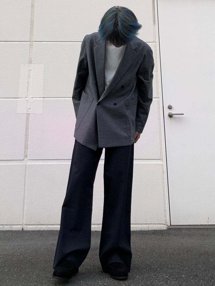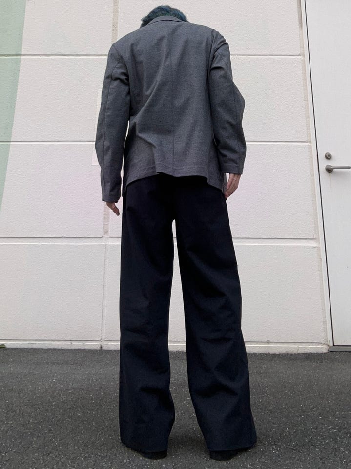 素材感/着心地:股上を浅くしてややフレアにし脚長見えするシルエットになっています、だいぶゆったりと大きいので三角形を意識できるスタイルにできます。