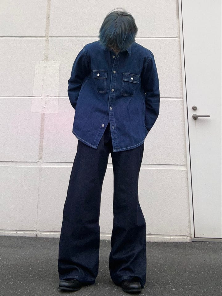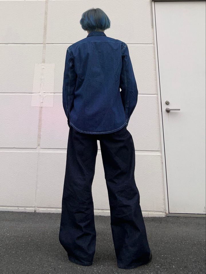 素材感/着心地:股上を浅くし、ややフレアにする事で脚長見えするシルエットになってます。適度な厚みのデニムで着続ける事で風合いの色落ちにより変化も見られます。