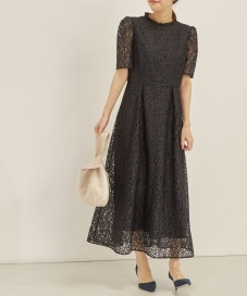 丈夫で上品なレース素材。袖と裾に透け感があり、黒ですが重たく見えません。ウエスト位置が高く、フレアスカートの形なので、スタイルアップして着ていただけます◎