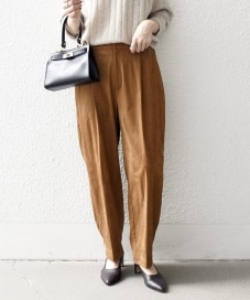 スエード素材ですがストレッチが効いていてとても歩きやすかったです。テーパードのシルエットなので、トップスは長めのものと合わせるとバランスよく見えます。