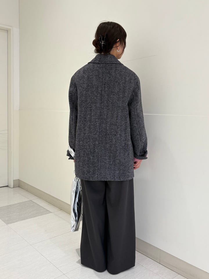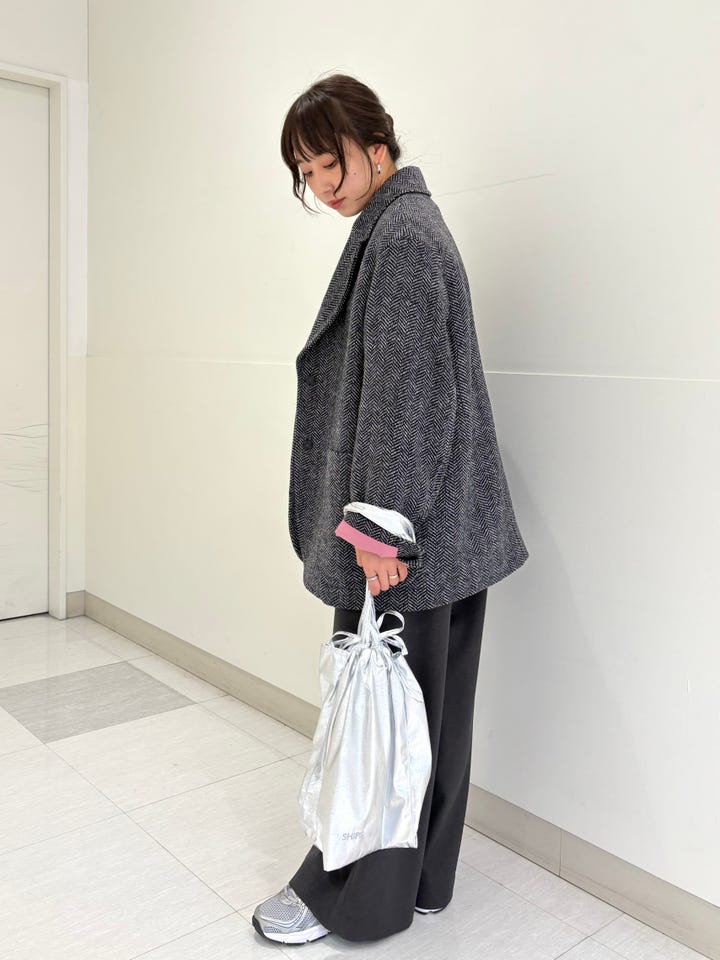 ゆとりがあるサイズ感で、ニットや厚手のスウェットなど合わせてもごわつかずに着れます。大人っぽいツイード素材ですが、裏地が可愛い差し色カラーになっており折り返して着てもオシャレです。