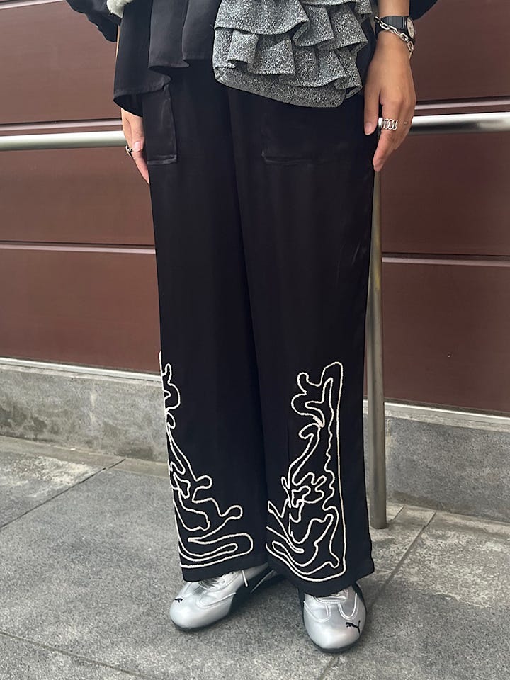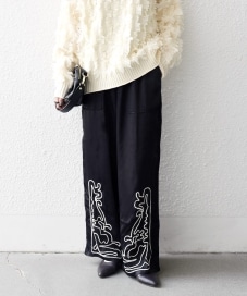 〔ONE SIZE〕SHIPS any:〈洗濯機可能〉サテン 刺繍 ストレート イージー パンツ