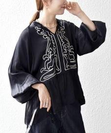〔ONE SIZE〕SHIPS any:〈洗濯機可能〉サテン 刺繍 スキッパー ペプラム ブラウス