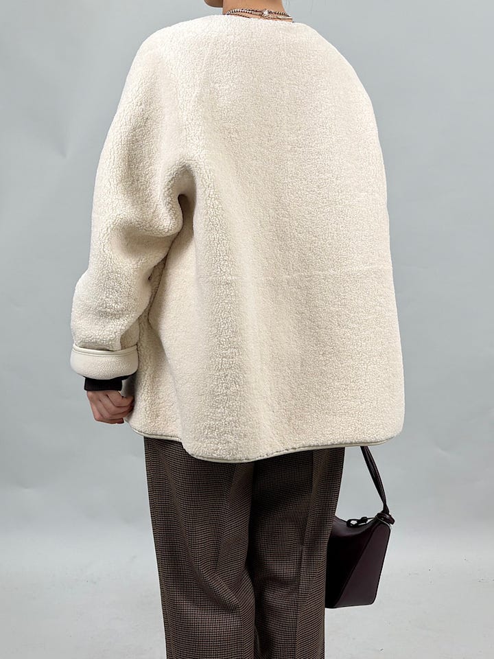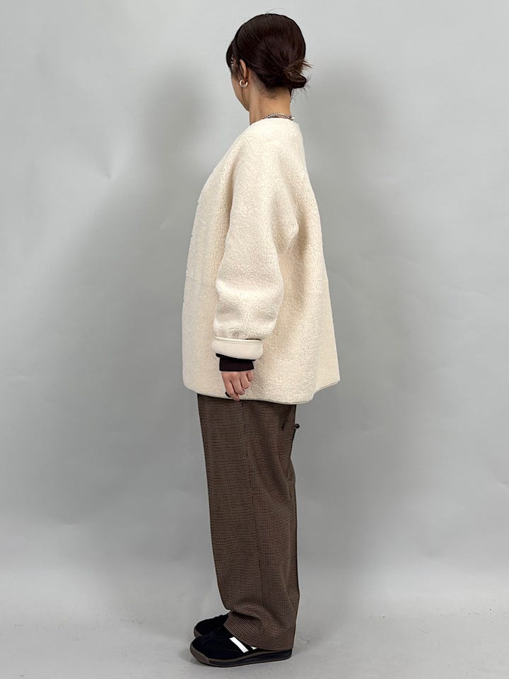 リバーシブルで軽いボアとフリース素材。とても軽くあたたかい着心地です◎脇下にマチをつけた立体的なシルエットなので、横に広がらずすっきり着ていただけます。