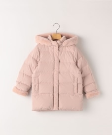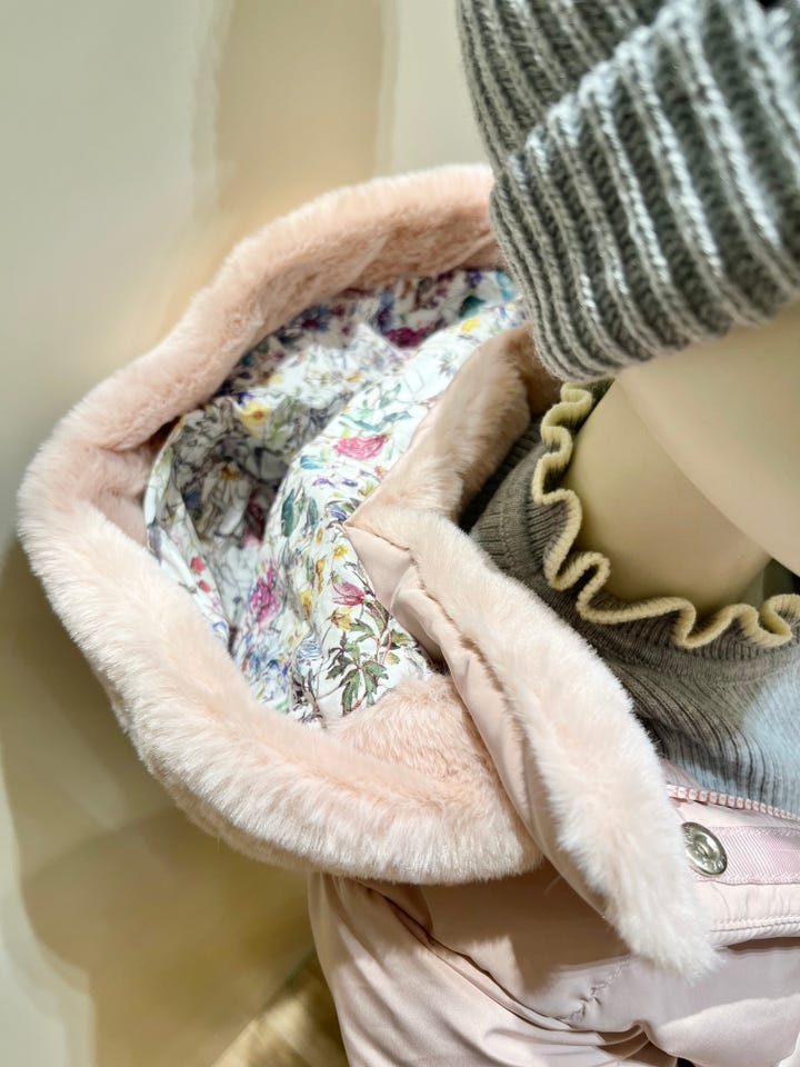 丈感はお尻にかかるくらいで、少し長めの丈のダウンジャケットです。袖部分は折り返すとファーが出てくるので、あえて少し大きめで着せても可愛い◎取り外し可能なフードにはリバティの花柄がプリントされていて、女の子の大好きが詰め込まれたアウターです♪