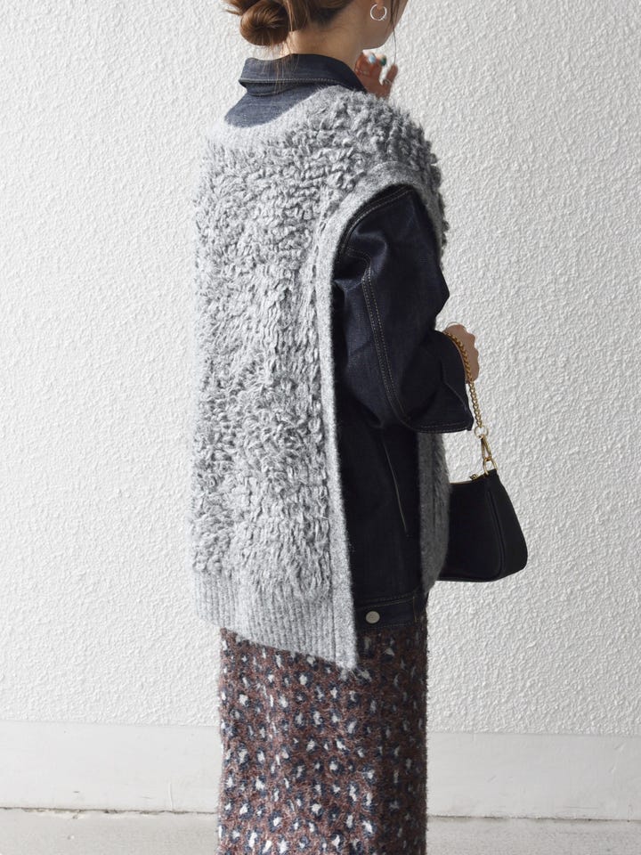 ニットベスト×レオパードスカートで、異素材をミックス。