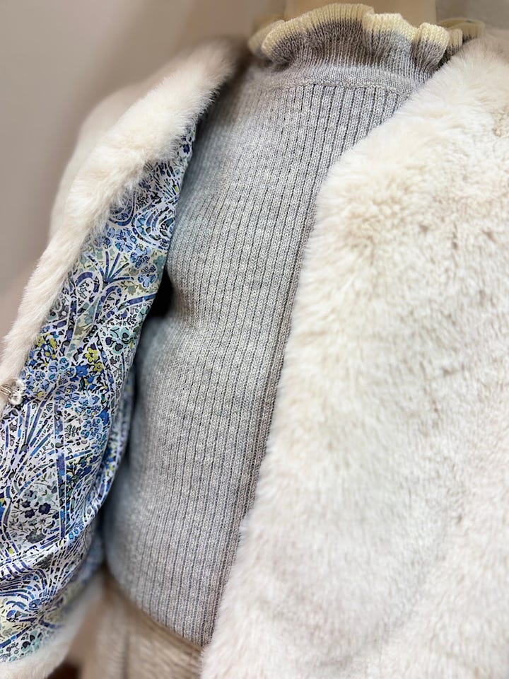 外側はフェイクファー、内側にはリバティ柄を使用したベストは、