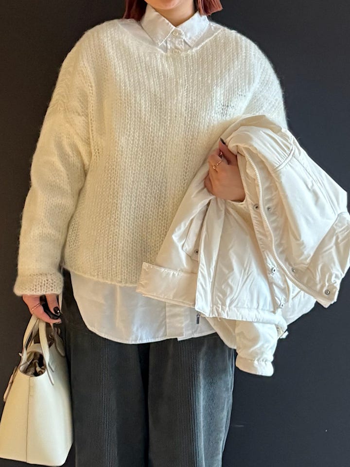 【着心地】軽くてモヘヤとナイロン素材なので柔らかく凄く着やすいです。少しゆとりがあるので今回シャツで合わせてみましたがロゴTなど合わせても可愛いです。