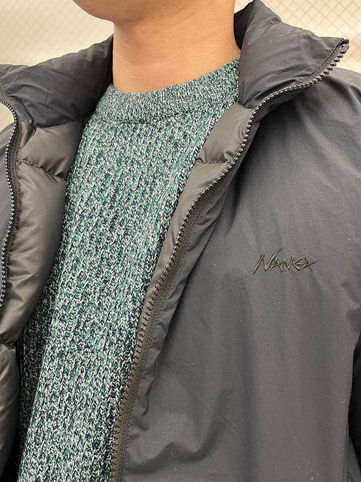 着心地:かなり軽く着るとほぼ重さを感じないのですが保温性はかなり高く真冬でもロンTの上に羽織るだけで過ごせます。