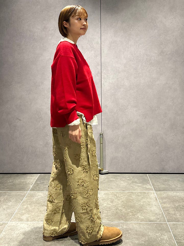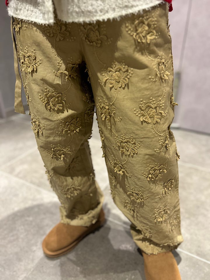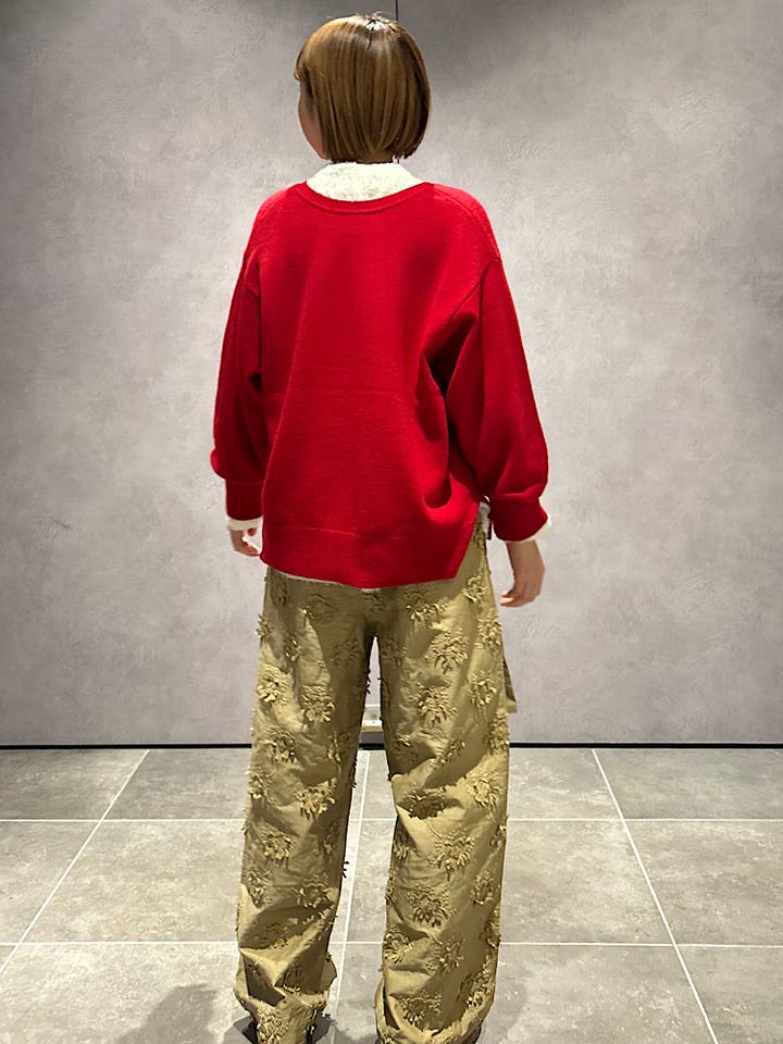 素材感・着心地:ウエストはゴム仕様で履きやすく、同素材のベルト付きでさらに調整も可能です。立体的な刺繍デザインが主役になるパンツです。甘いブラウスやカジュアルにスウェットを合わせても幅広いコーディネートができそうです。