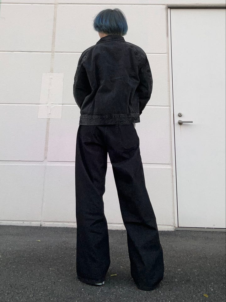 素材感/着心地 : しっかりとした厚みのあるデニム素材で90年代のデニムの色の雰囲気を再現しています。