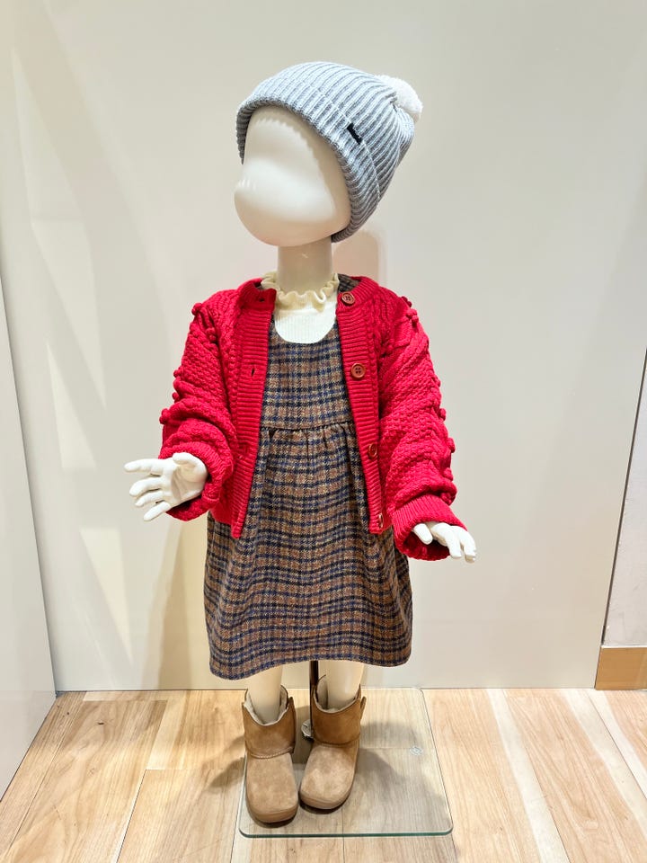 柔らかなニットカーディガンです。チクチクしないのでお子さまも着用していただきやすく、体温調整に重宝する一枚です◎