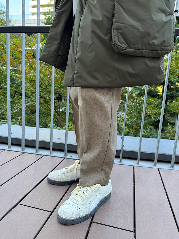 ややゆとりのあるイージーパンツながら、センタープレスを入れることできれいめな雰囲気も持ち合わせています。