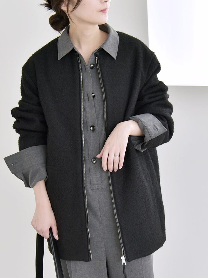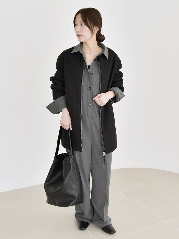 着心地:ウールのような厚手の生地。ノーカラーなので、襟もとにデザインがあるトップスでもすっきりと着られました。