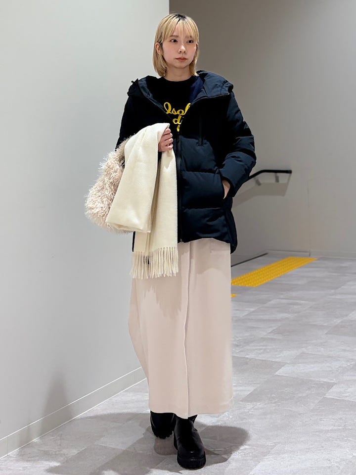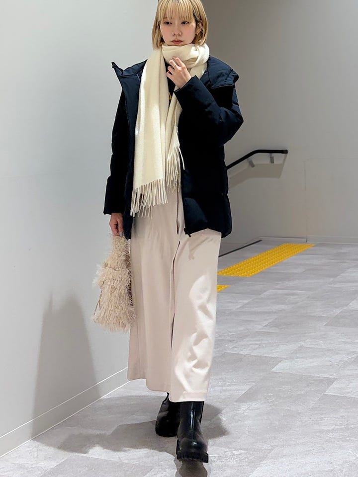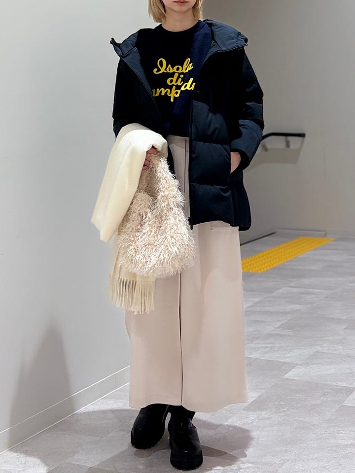 【素材感・着心地】落ち感のきれいなシルエット。かなり着心地も◎透け感は気になりませんでした。ストレッチが効いていて歩きやすいです!冬らしい温かみのある白の色味で沢山活躍しそうです!