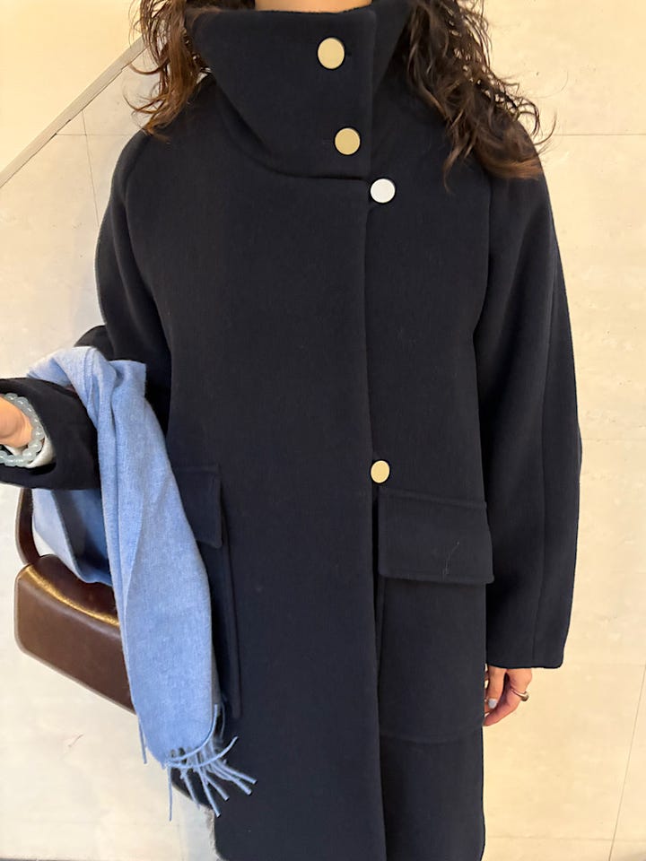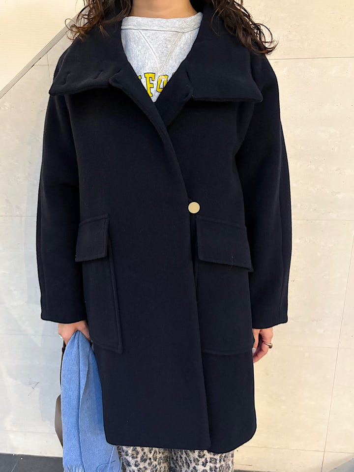 ぶかっとしたサイズ感ですが、とても軽くて暖かいです。首も高さがあるので、折らなければマフラーいらずです。きれいめにもカジュアルにも着ていただきやすいデザインです。