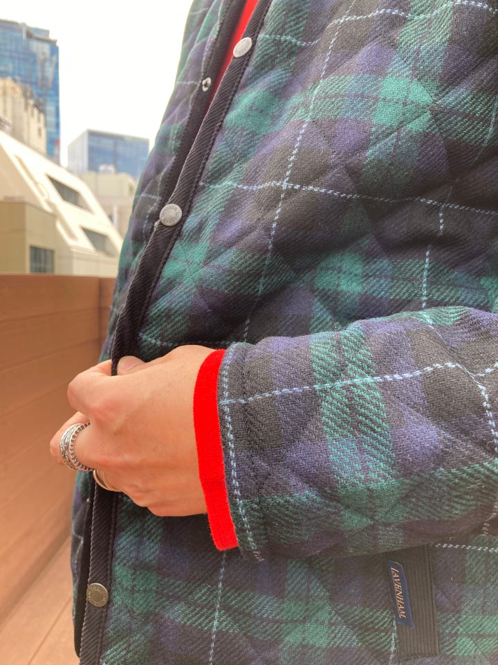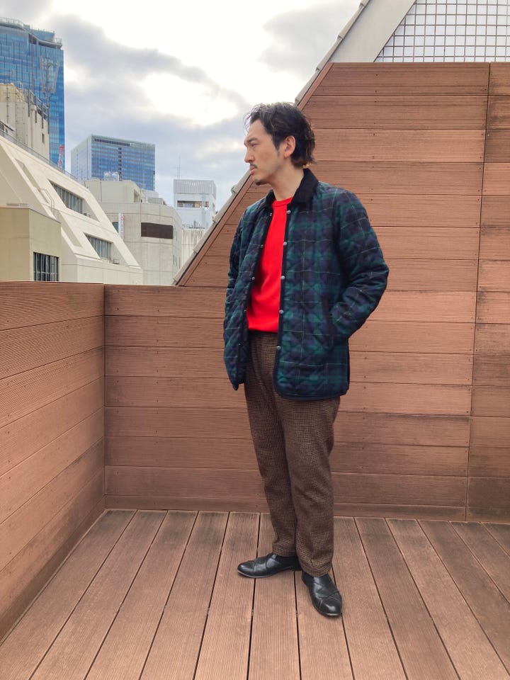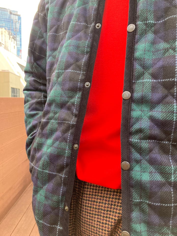 素材感/着心地:ウール生地の温かみのある素材感に落ち着いたチェックを施したシックな一着。適度にゆとりがありジャケットが隠れる着丈でビジネスアウターにもオススメです。