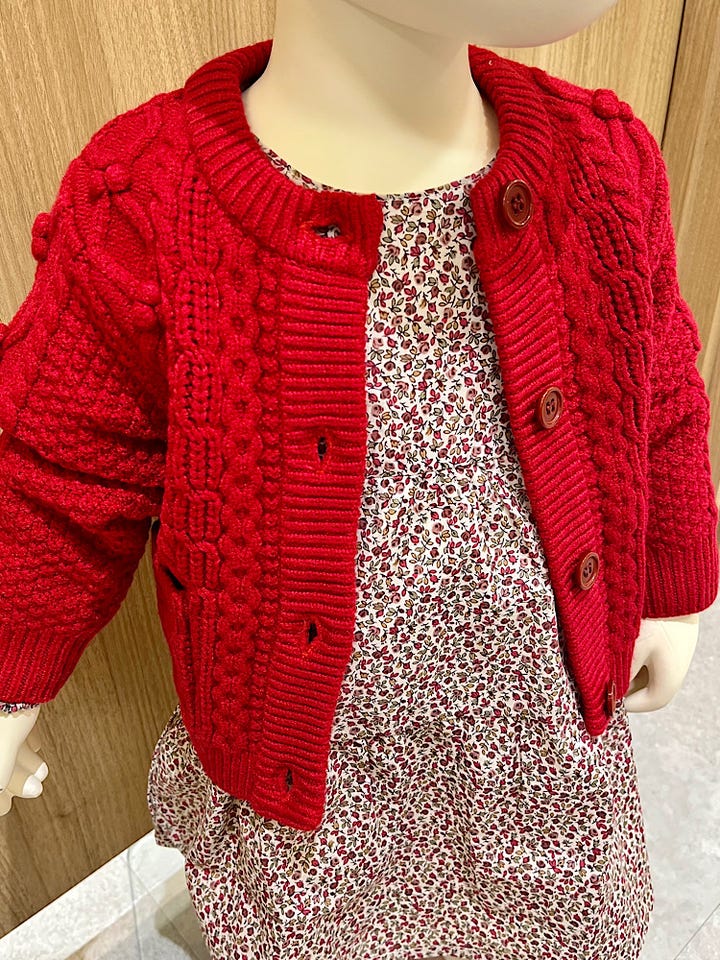 目を引く赤いニットカーディガンはコーディネートに華やかさをプラスしてくれます♪