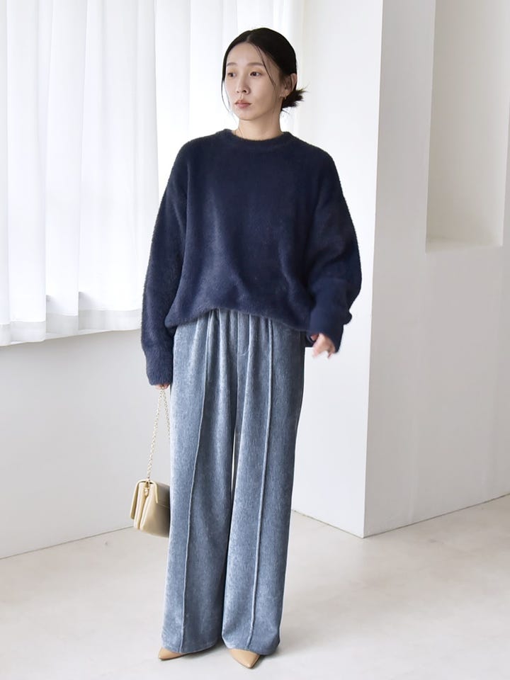 サイズ感:着丈はヒールを履いて床すれすれくらい。脚のラインを拾わないシルエットでリラックスして穿けます。