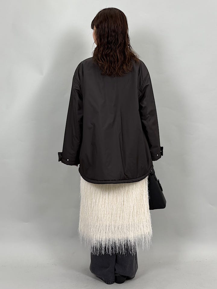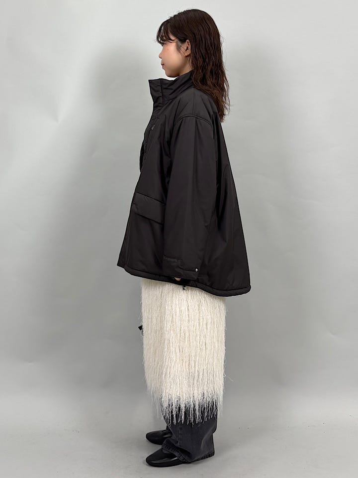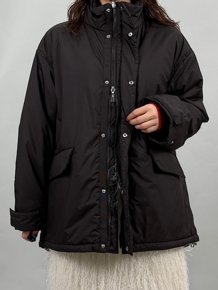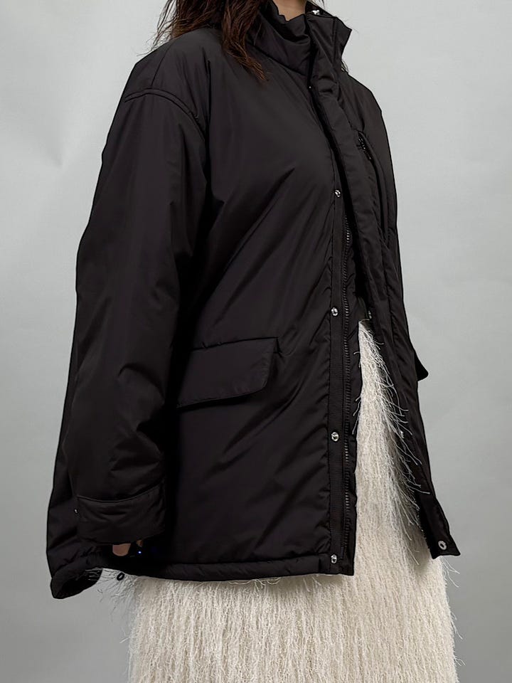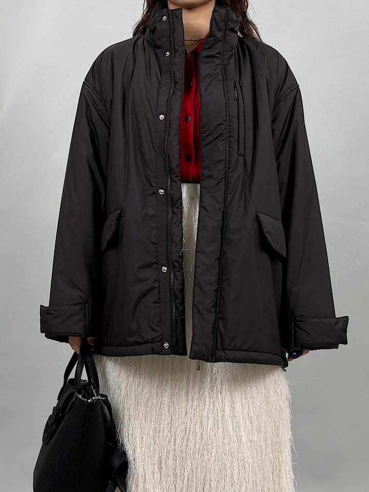 とても軽い中綿素材。中綿と思えないほど軽く、とても楽な着心地です◎ネックも高すぎないので、上からマフラーを巻いても嵩張りません。裾のドローコードを絞って形を変えていただけます。ゆったりしたサイズ感ですが、ダブルジップなので、すっきり着ていただけます!