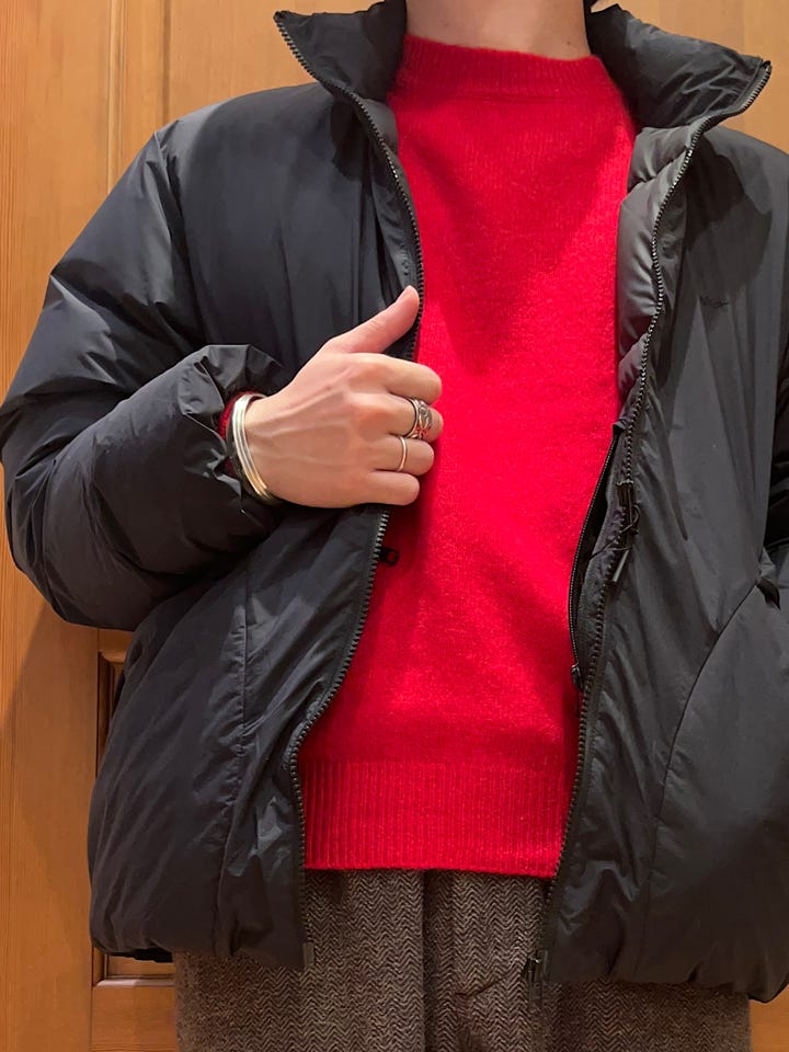 【素材感・着心地】ヤクの毛とウールを使用したブレンドニット。柔らかい肌触りで着膨れしないスマートなシルエット。細い糸を使用しており、高級感がある。