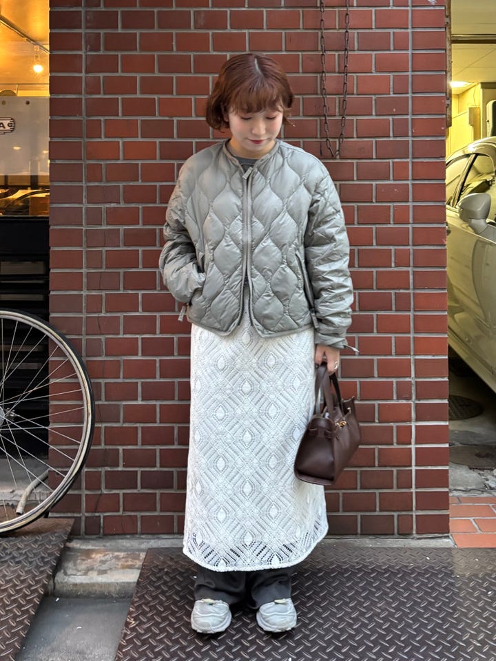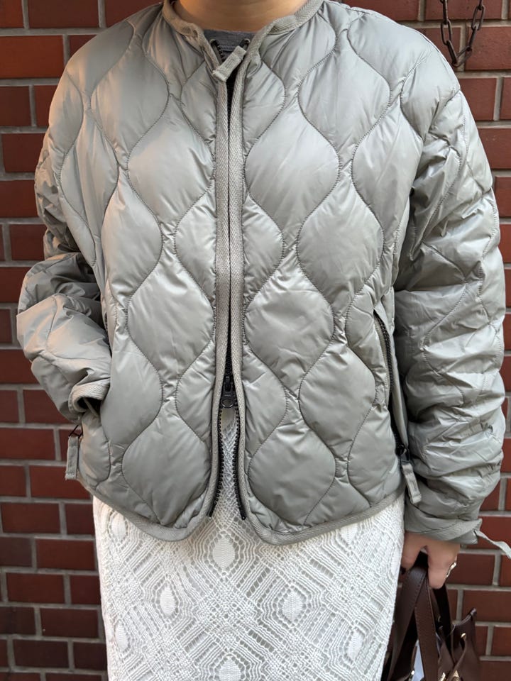 着心地:ダウンとフェザーがしっかり入っているので冬もしっかりこせるくらい保温性に優れています。丈短めなので小柄な方でもバランス良く着ていただけます。サイドにジップがあるのでボトムのシルエットによっては開閉してシルエットを変えて着ていただけます。Wai+ならではのニュアンスカラーが一目引く1着となっております。