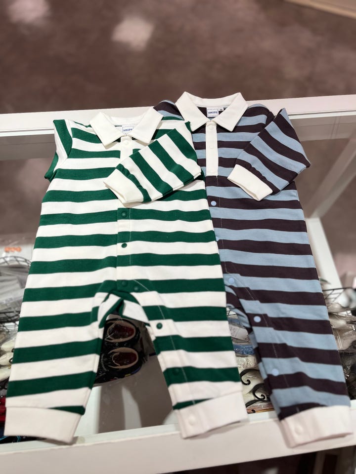 白襟とボーダーが魅力なラガーシャツ風のロンパース。