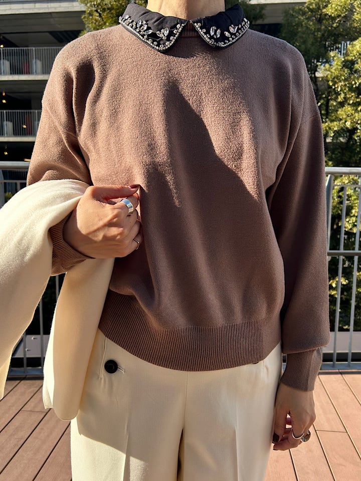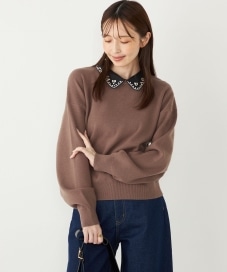 【素材感・着心地】トレンド感のあるビジューをあしらい、伸縮性のある柔らかな風合いなニットです。コンパクトな着丈でボトムを選びません。