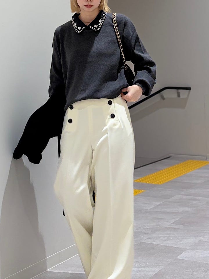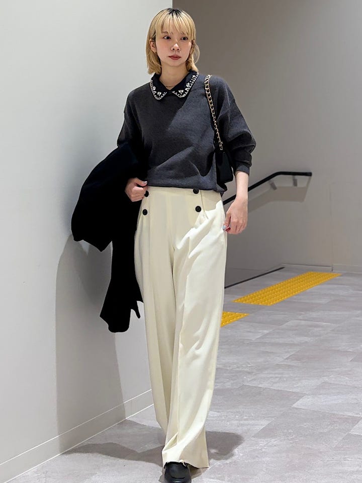【素材感・着心地】襟のビジューが特徴的で顔の近くにある為、華やかな印象です!きれいめにもカジュアルにも使って頂けそう!チクチク感なし!